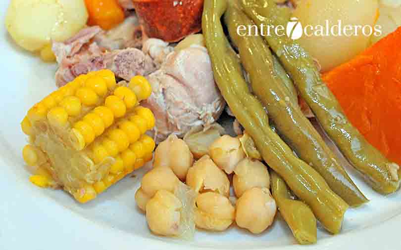 Este guiso combina distintas carnes, habitualmente vaca, cerdo y pollo, con garbanzos y una amplia variedad de verduras propias del entorno insular, como batata, calabaza, bubango, col, zanahoria o piñas de millo. La abundancia de productos vegetales es una de sus características más definitorias y responde a la tradición agrícola del archipiélago.